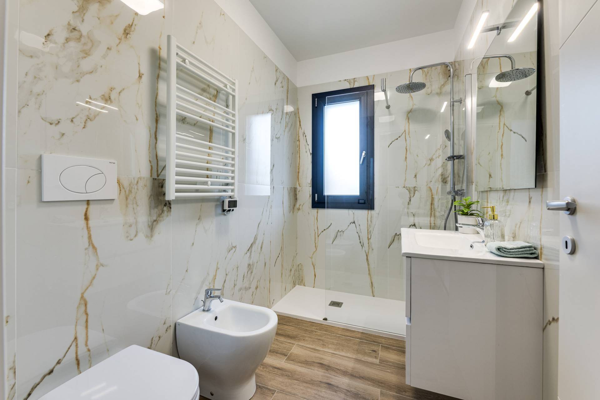 Lo stile architettonico, moderno e elegante è realizzato con materiali e finiture di prima scelta. Il complesso è dotato di ascensore, pannelli fotovoltaici, predisposizione pannelli solari e bagni rifiniti e completamente arredati. Riscaldamento e raffrescamento canalizzato a pompa di calore. Le ampie finestre conferiscono una piacevole luminosità in tutti gli ambienti valorizzando al meglio questa nuovissima proprietà.