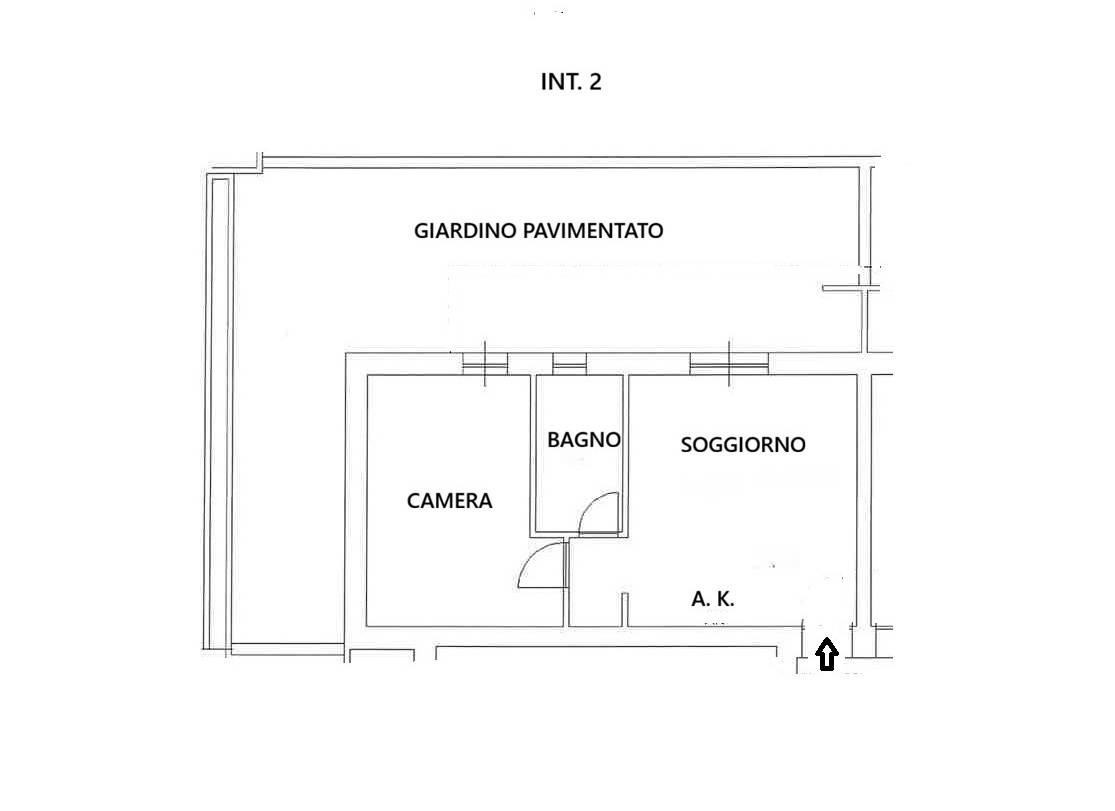 Piano terra composto da: Soggiorno con cucina a vista, disimpegno, camera da letto, bagno con finestra, ampio giardino angolare in parte pavimentato e posto auto scoperto.