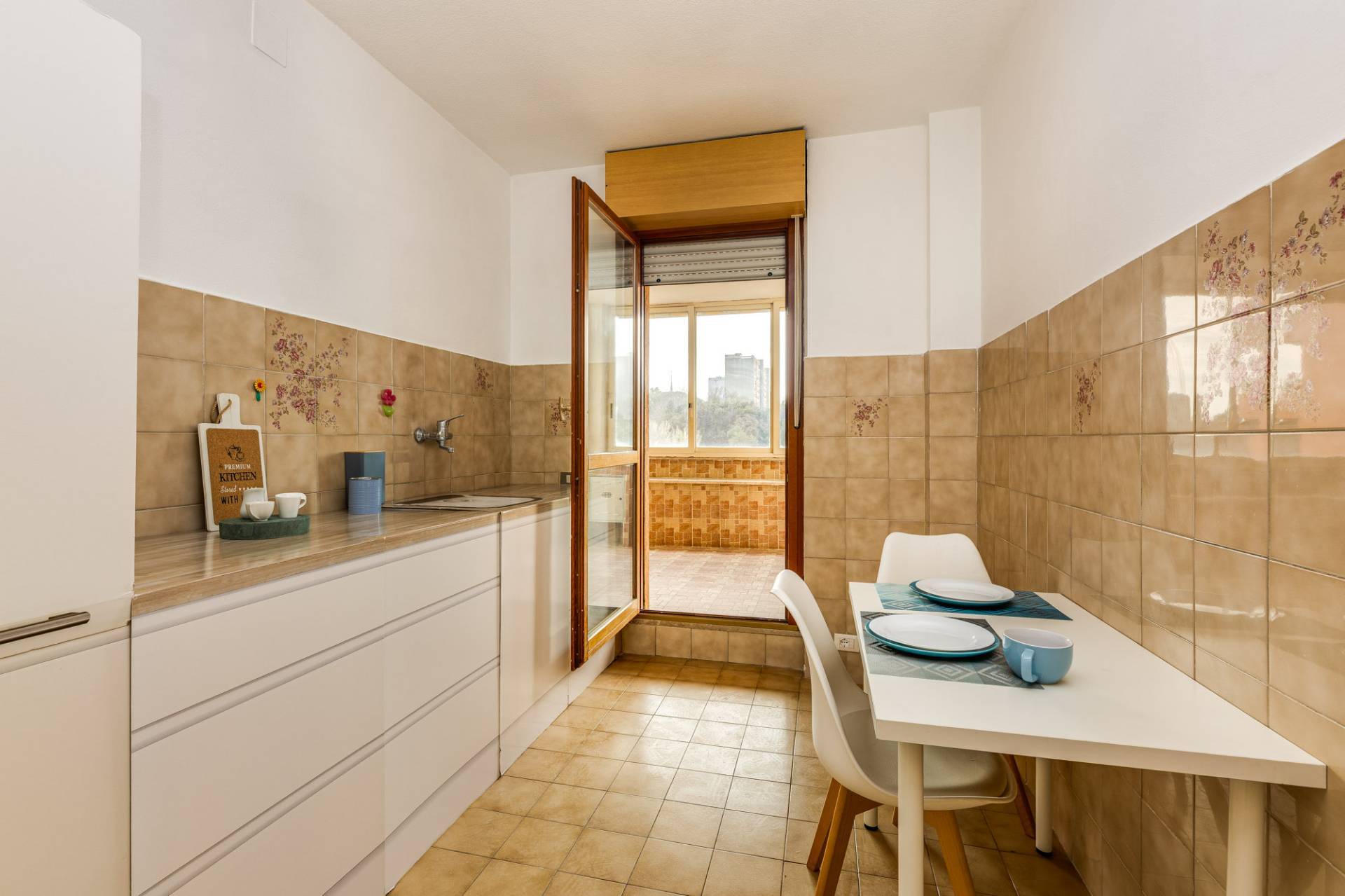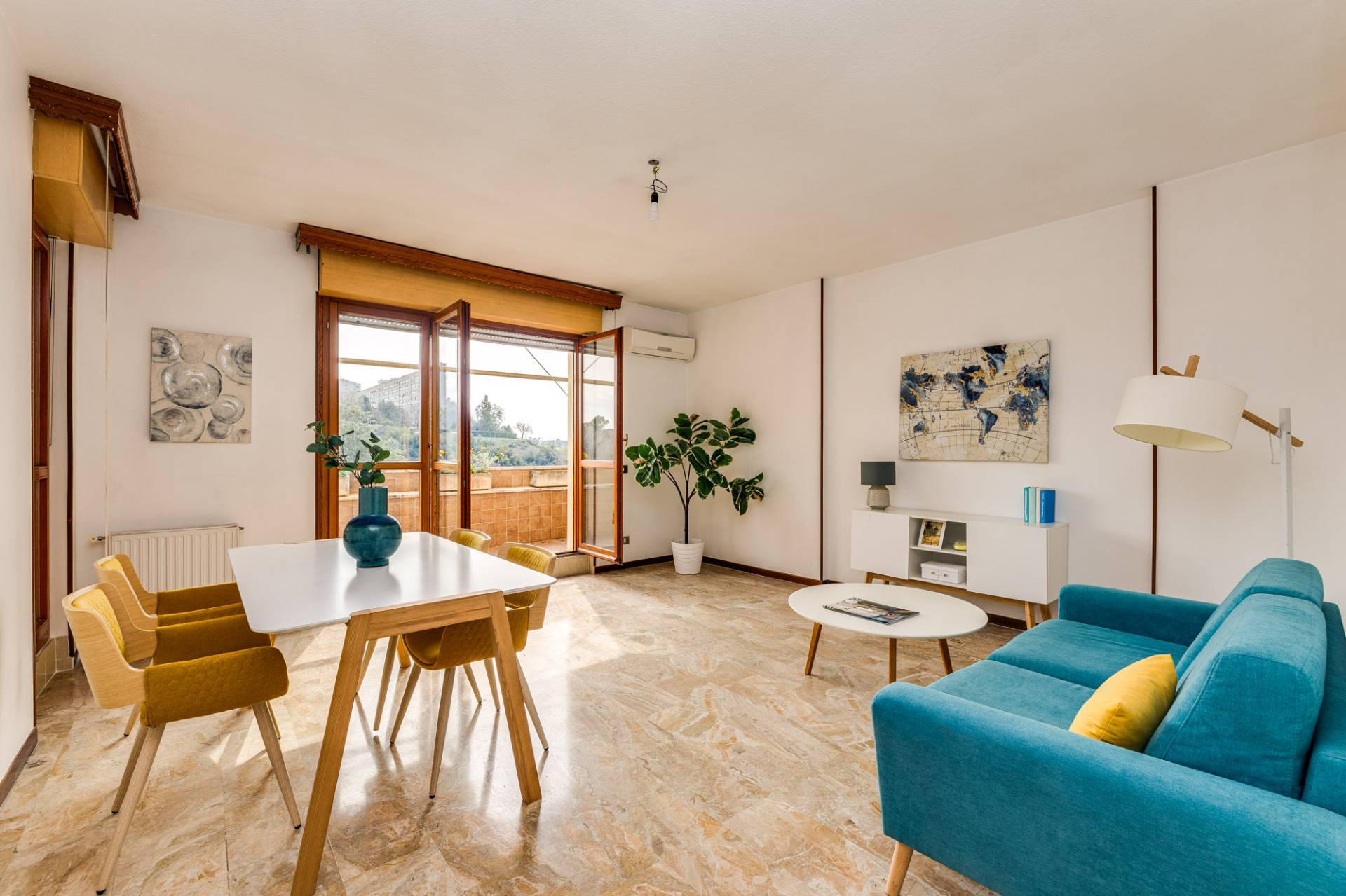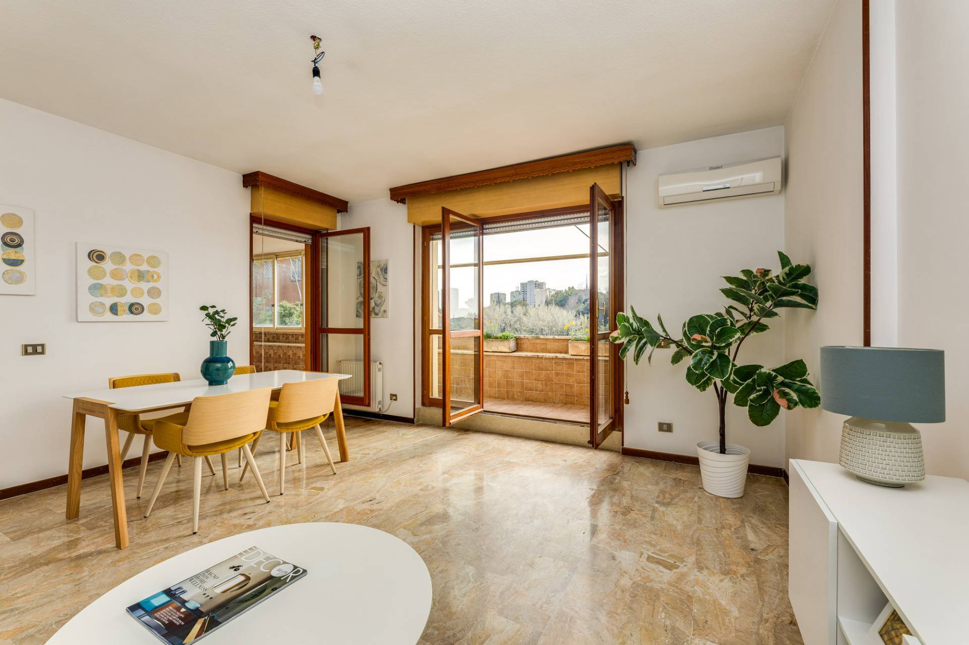 Nella silenziosa Via Carlo Emilio Gadda, adiacente al quartiere Fonte Ostiense e a pochi minuti dalla Riserva Naturale "Laurentino Acqua Acetosa", proponiamo in vendita, al sesto piano di un condominio di fine anni '80, con ascensore, un appartamento di 128 mq catastali, tripla esposizione, parzialmente da ristrutturare. L'appartamento è così suddiviso: ingresso, luminoso soggiorno con accesso al terrazzo, due camere da letto matrimoniali, di cui una con accesso al terrazzo, terza camera di 12 mq con balcone, cucina con accesso al terrazzo, due servizi, di cui uno con finestra e cabina doccia e l'altro con aspiratore ed ampia cabina doccia. Completano la proprietà una cantina di 7 mq ed un BOX AUTO di 14 mq catastali. Infissi doppio vetro in legno, riscaldamento autonomo, climatizzatore in soggiorno.
