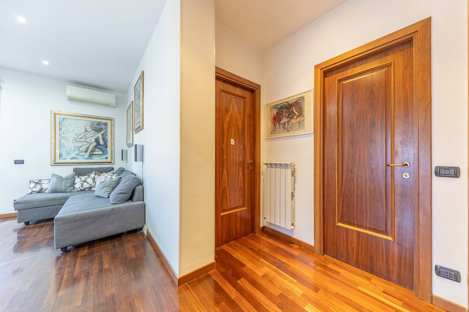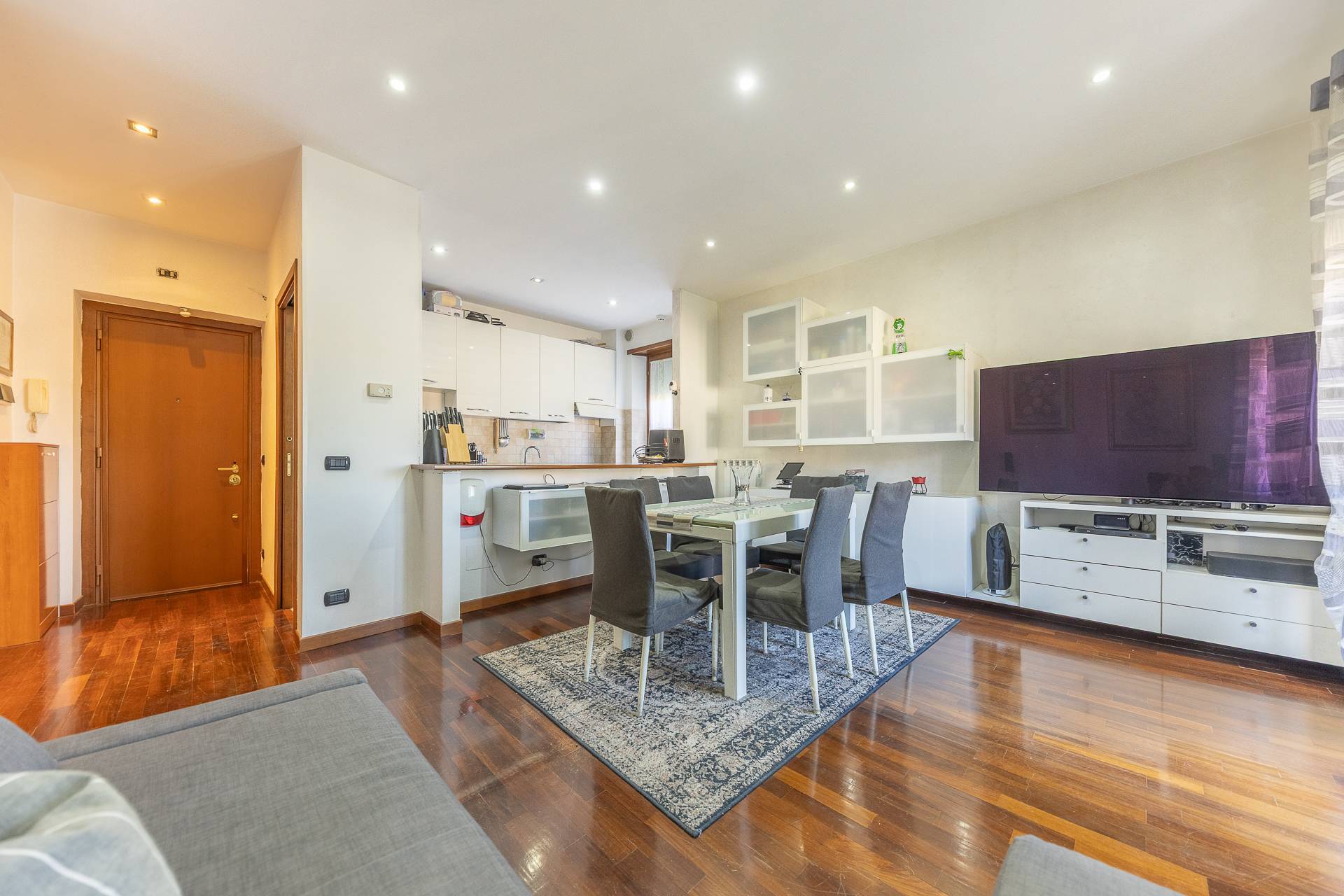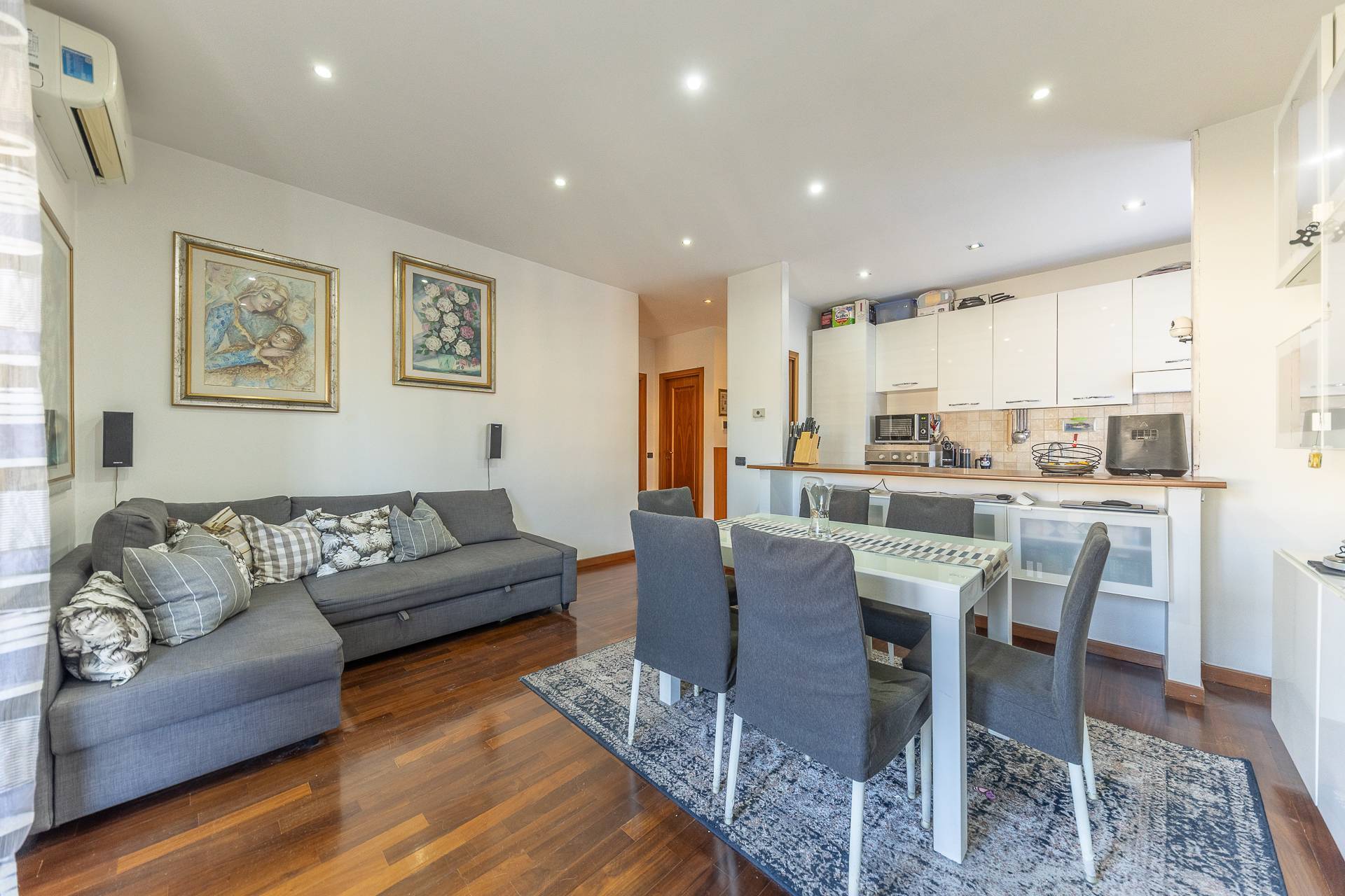 L'appartamento colpisce subito per la sensazione di accoglienza e per la qualità delle finiture. Gli ambienti sono ben distribuiti e funzionali: un soggiorno ben organizzato con accesso al balcone, una cucina a vista moderna, anch'essa con accesso sul secondo balcone, due camere da letto confortevoli e due bagni, di cui uno in camera. Il parquet in tutte le stanze dona calore e armonia agli spazi, rendendo l'abitazione elegante ma al tempo stesso pratica e vivibile.