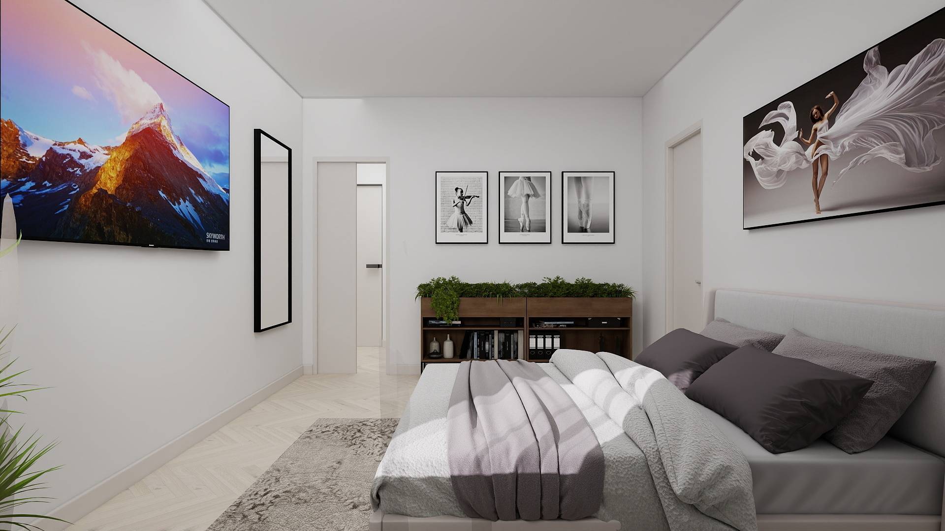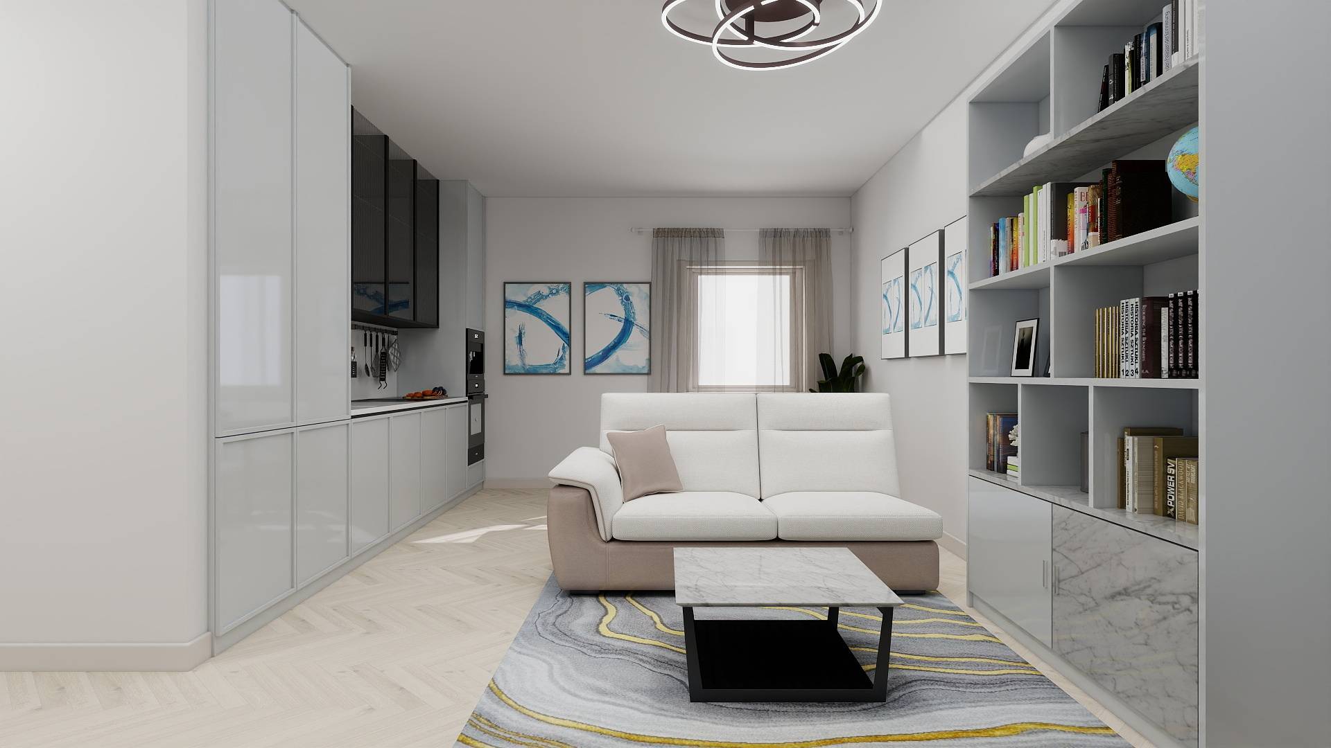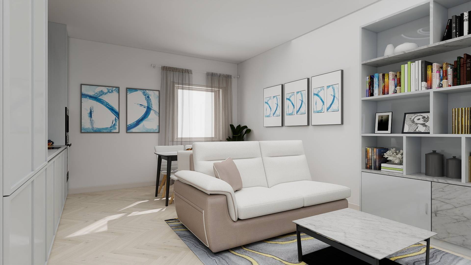 Ingresso, accogliente soggiorno con cucina a vista, un bagno ed una camera con cabina armadio.