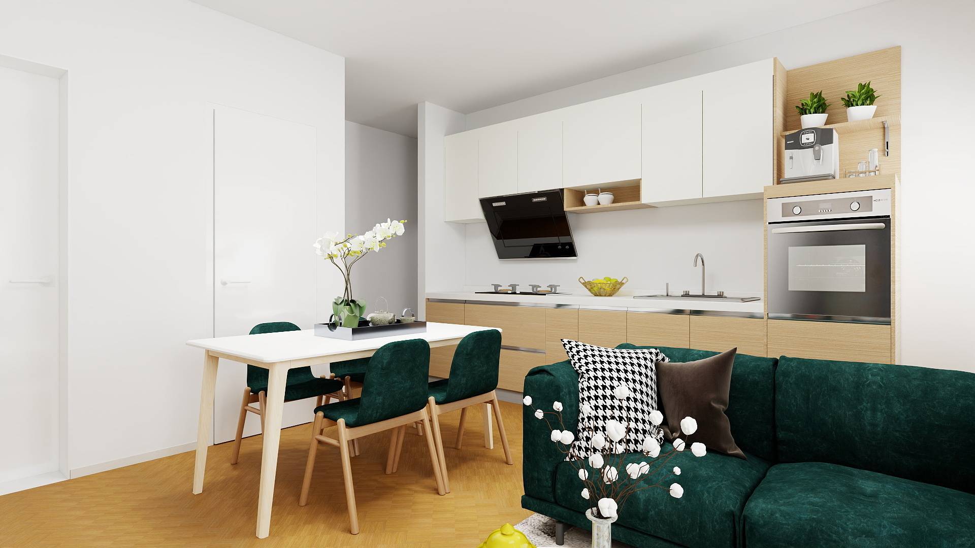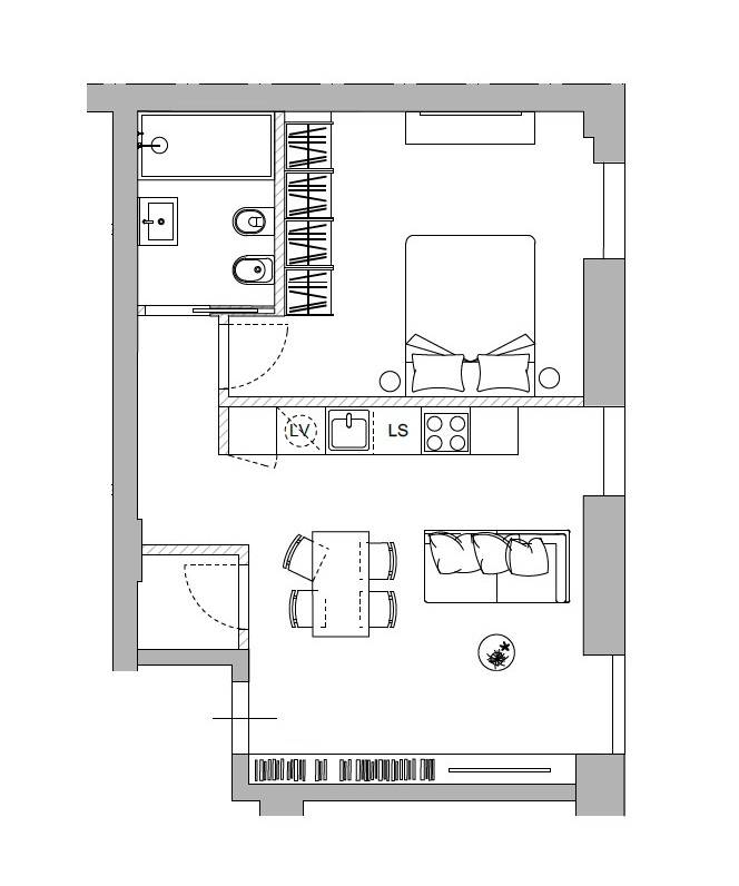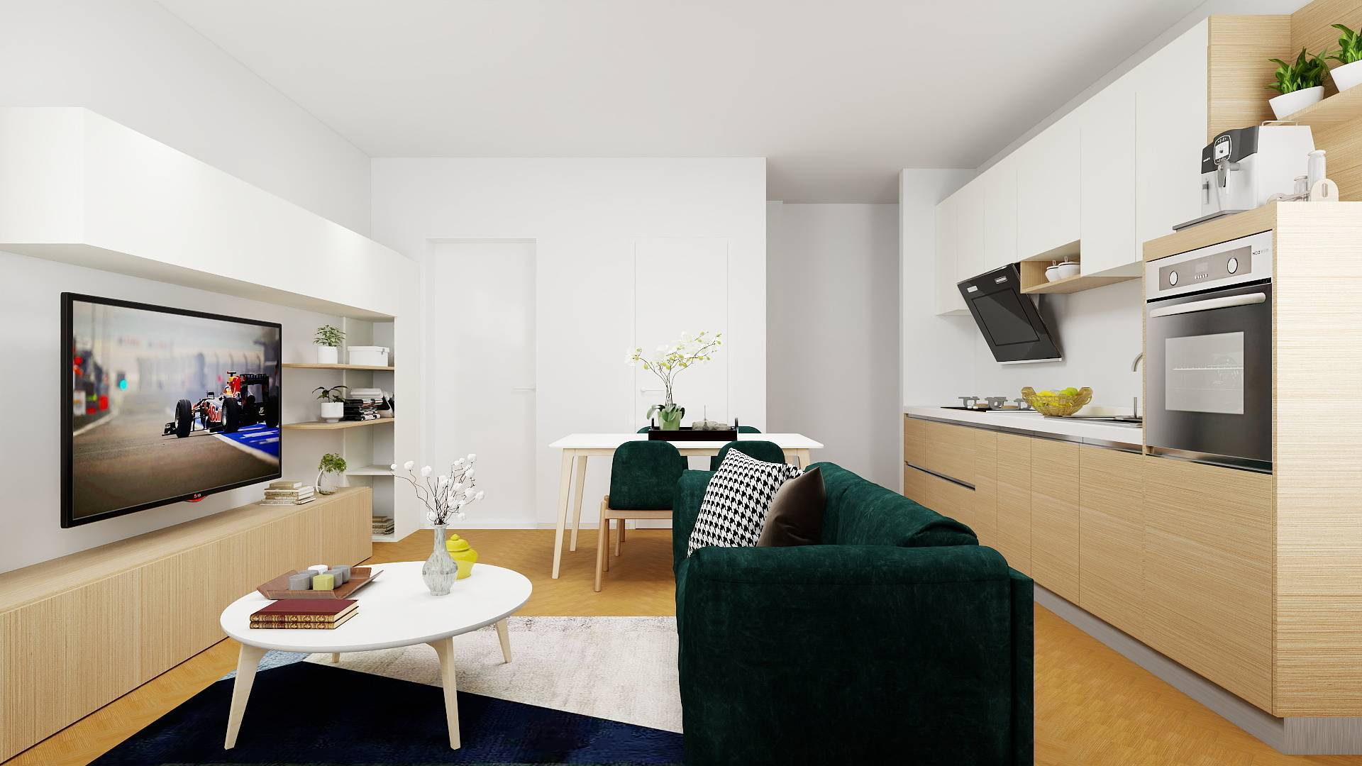 Accogliente soggiorno con cucina a vista, un bagno, una camera ed un ripostiglio.