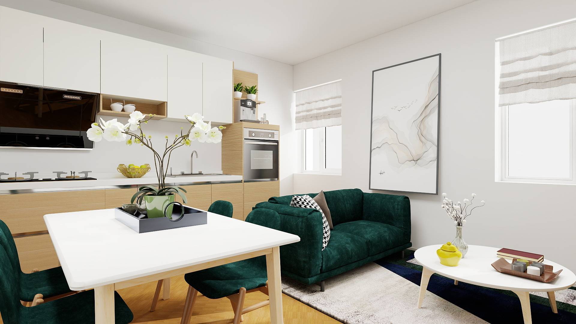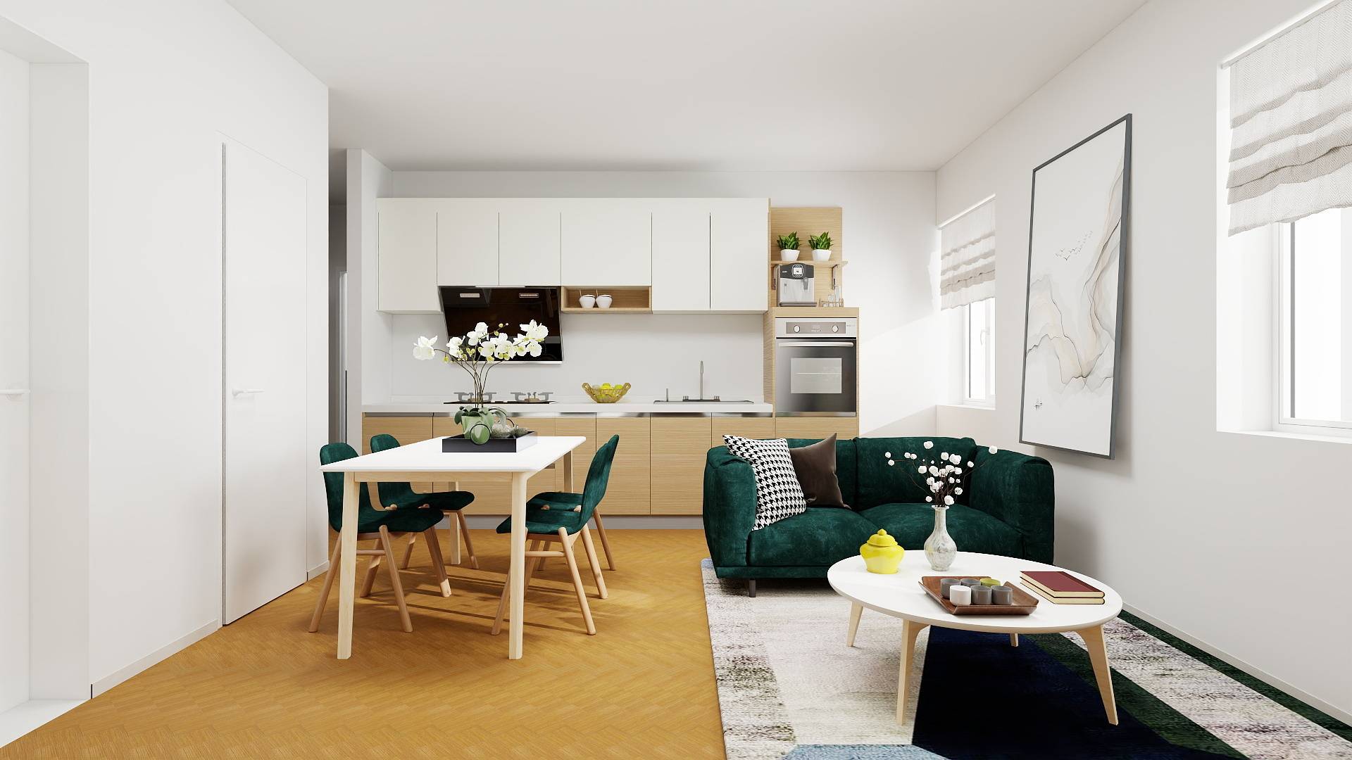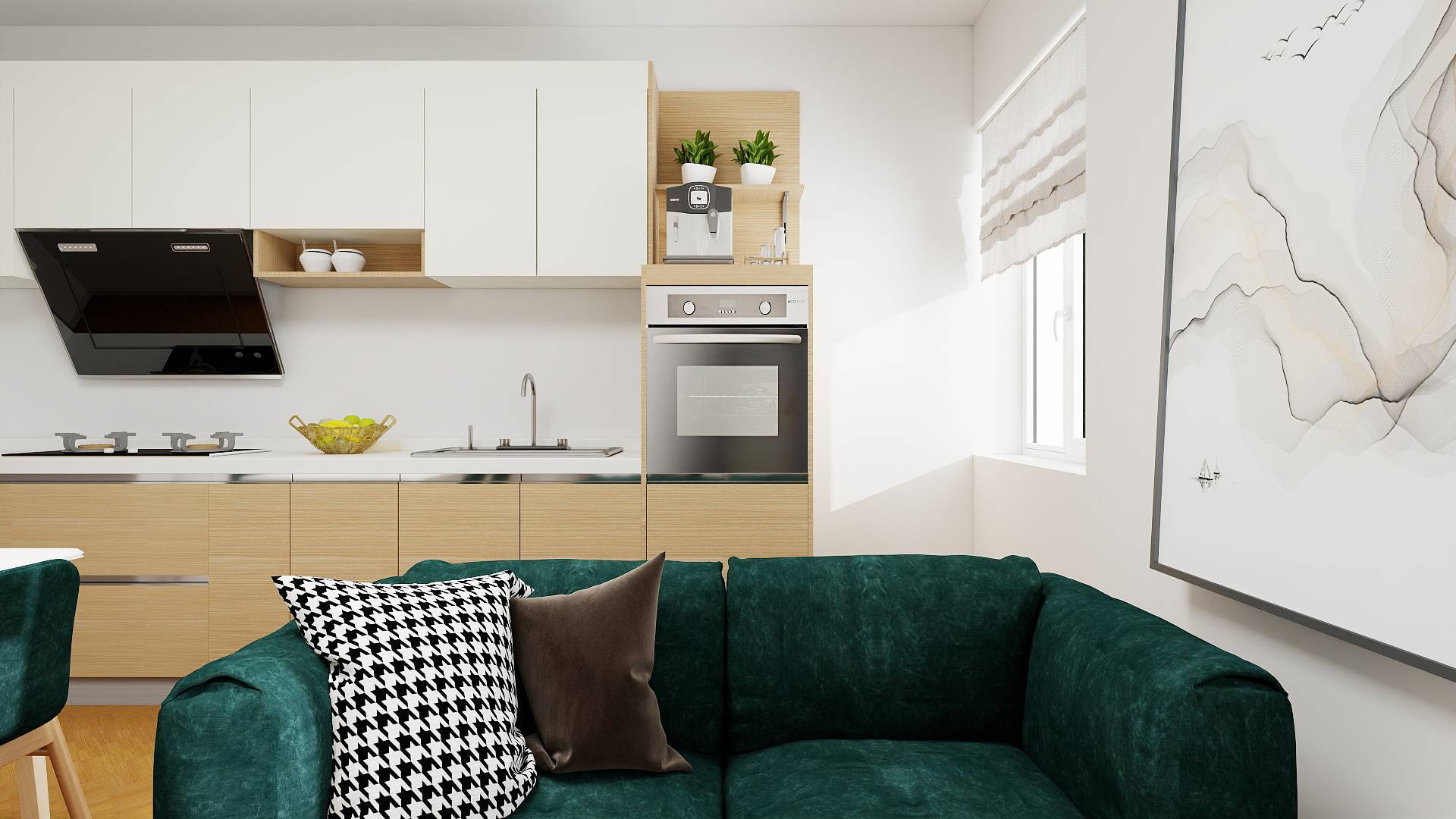 Accogliente soggiorno con cucina a vista, un bagno, una camera ed un ripostiglio.
