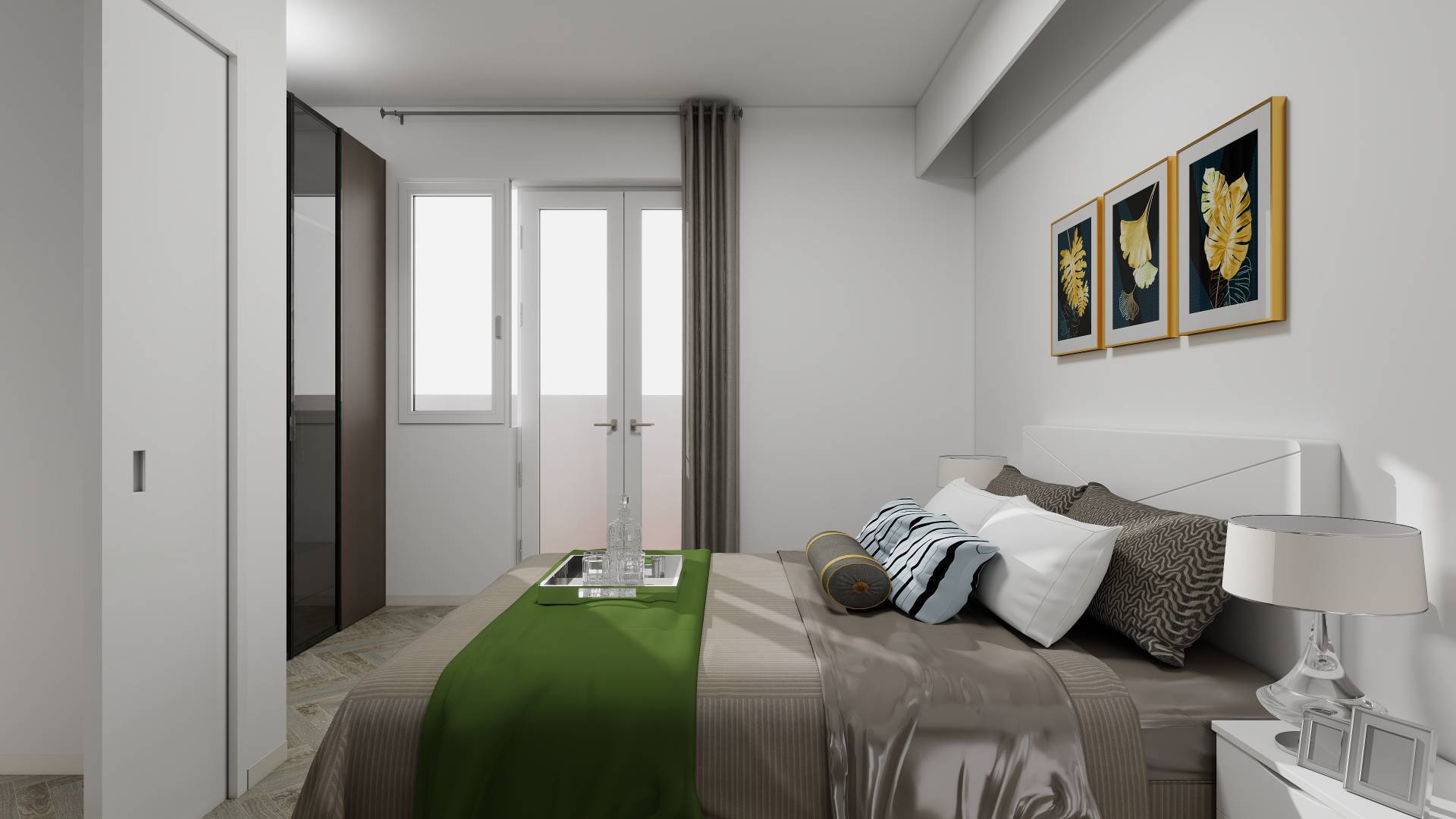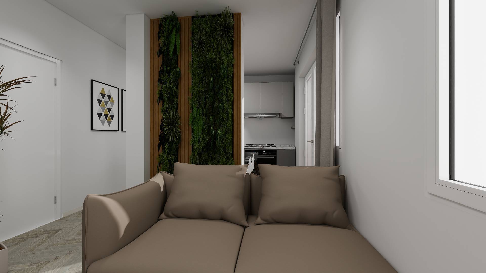 Ingresso, soggiorno con cucina a vista, camera da letto, ripostiglio e bagno e doppio balcone. Esposizione ovest.