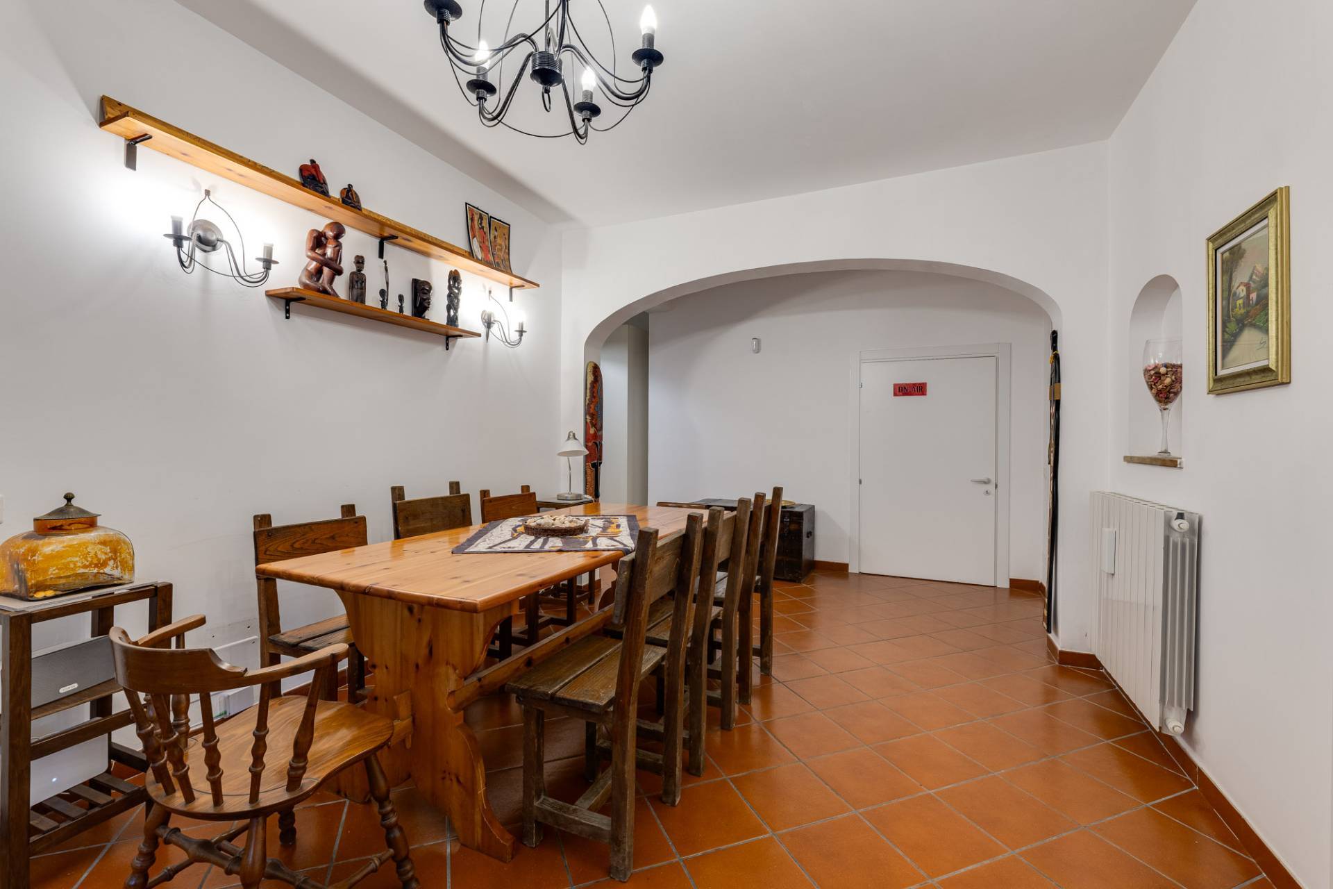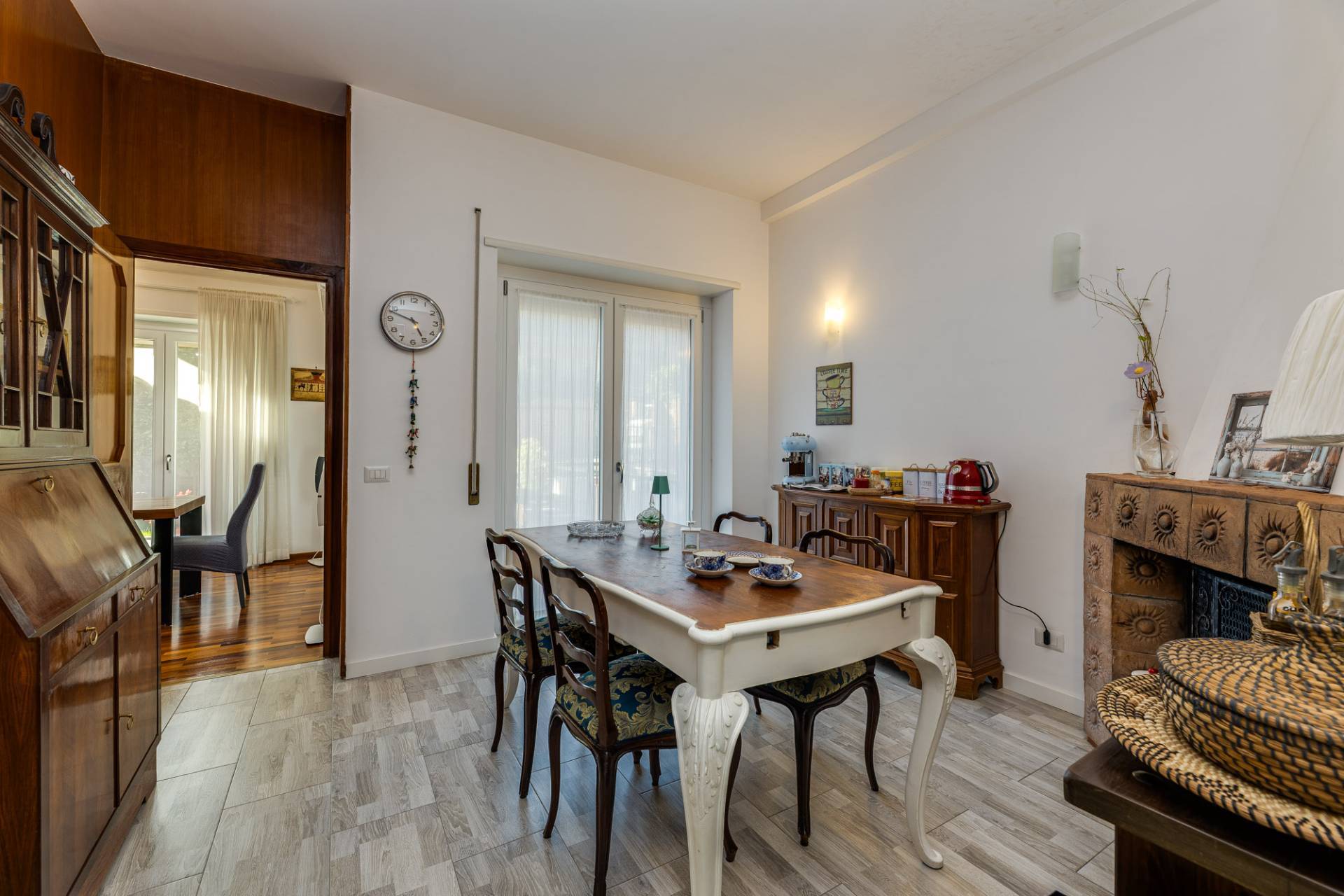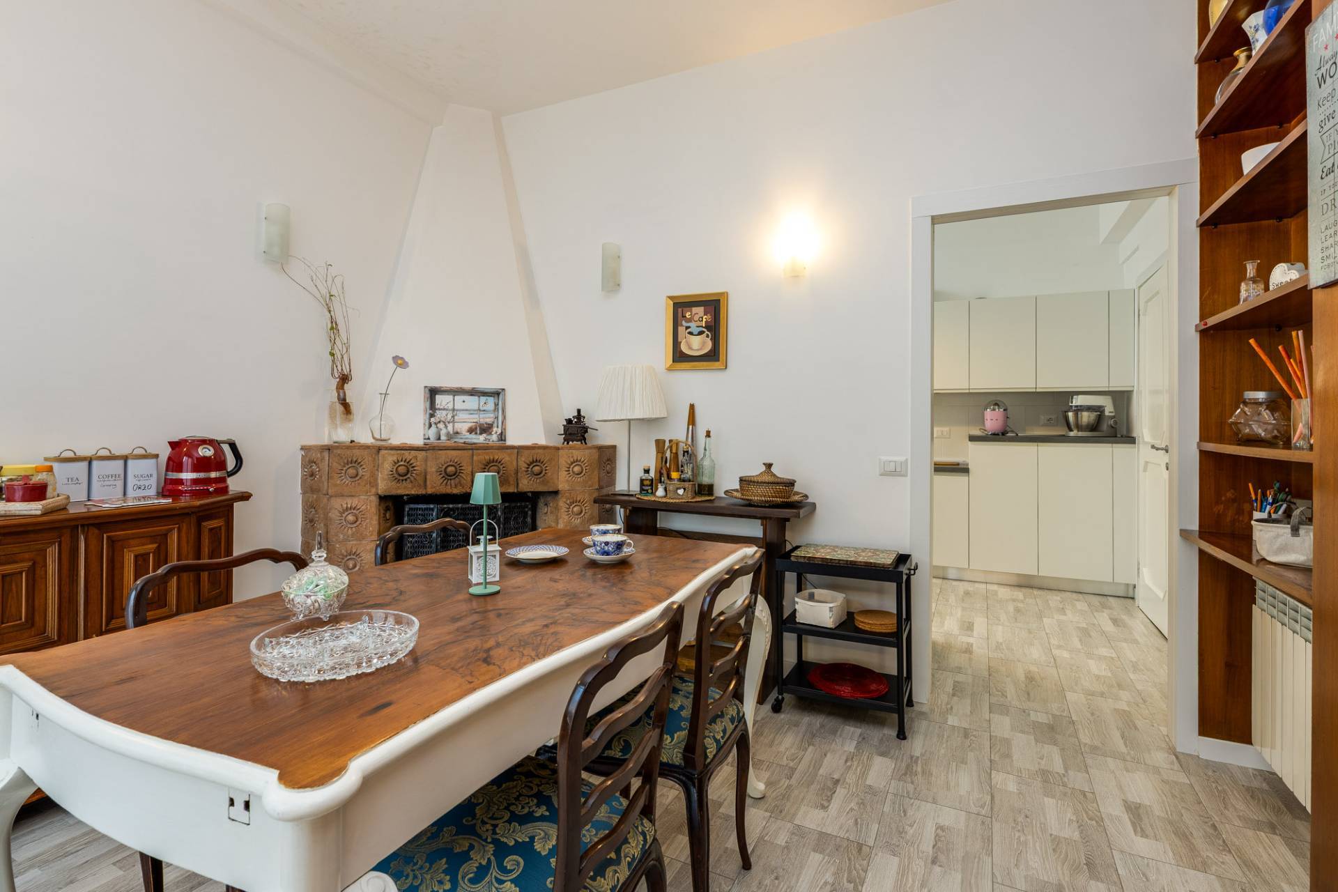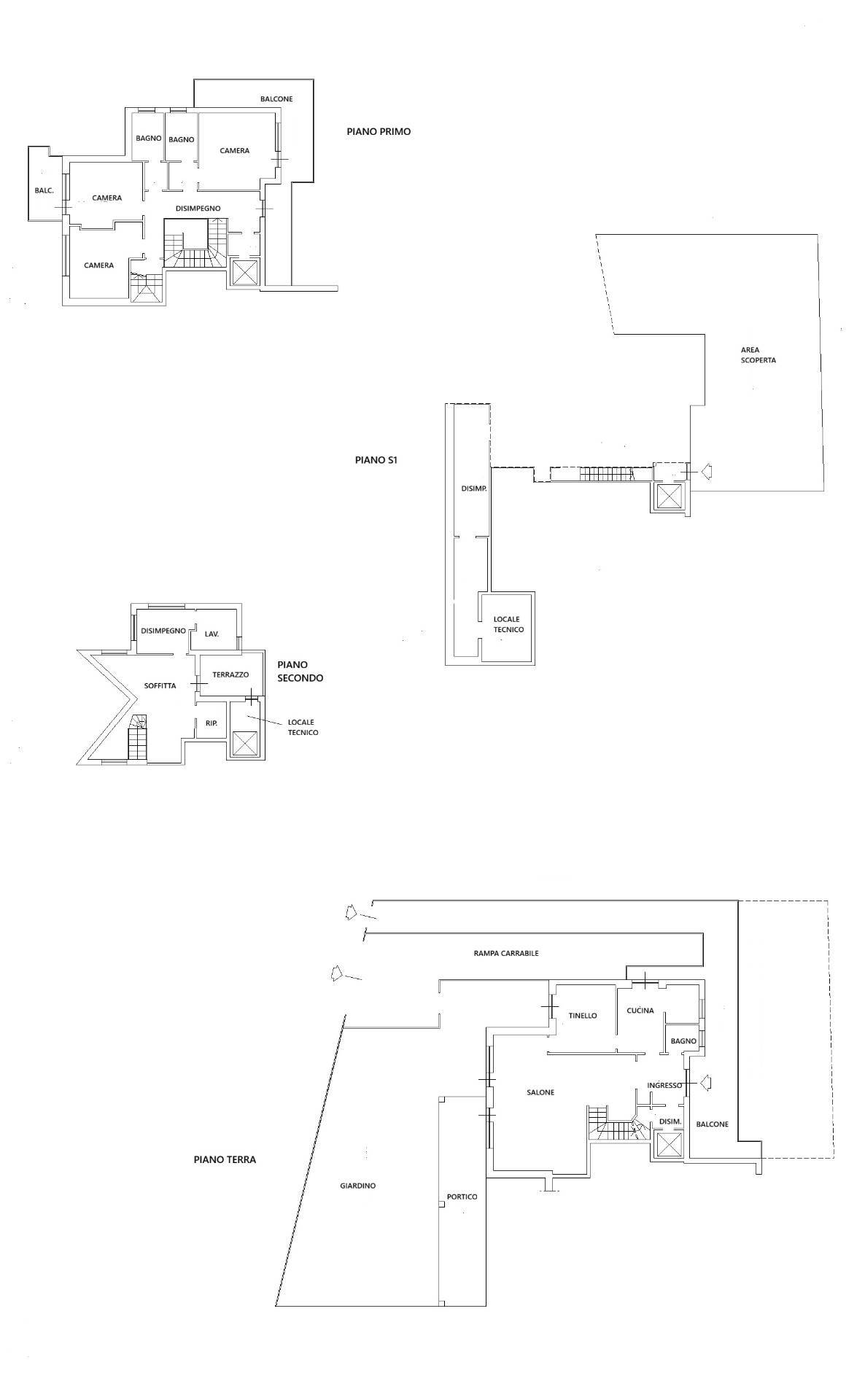 Al piano terra, un salone doppio dalle generose dimensioni dotato di camino, la cucina abitabile, il tinello anch'esso con camino, un bagno di servizio e lo spazio esterno con porticato, giardino e terrazzo sul retro.