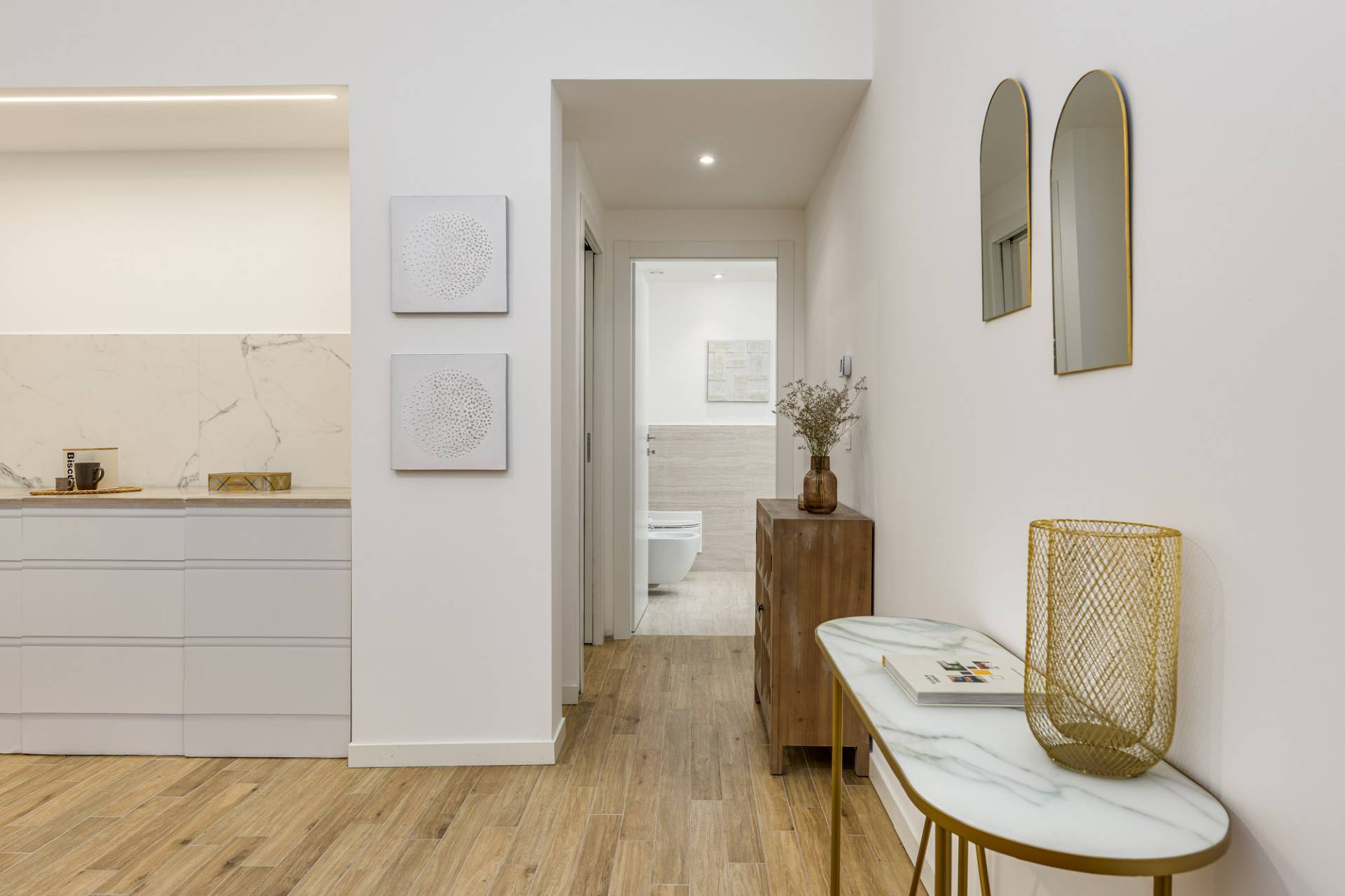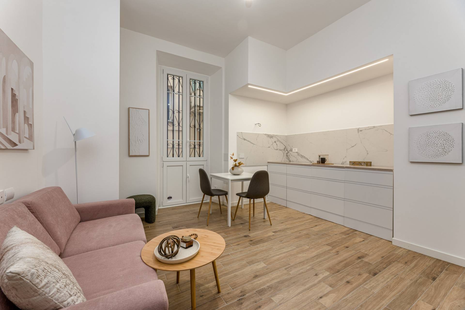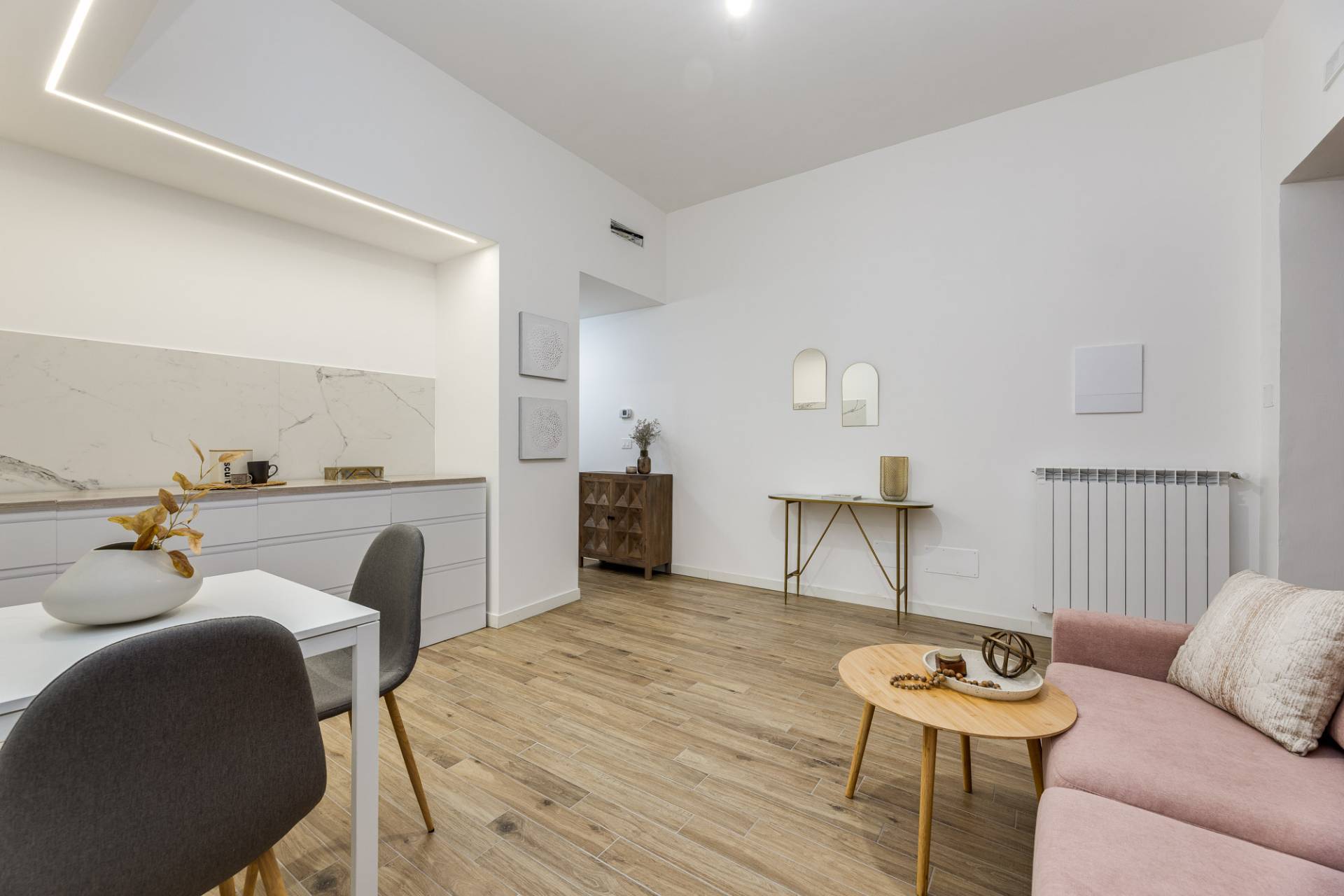 Ingresso sull'accogliente soggiorno con cucina a vista, disimpegno, camera da letto e bagno.