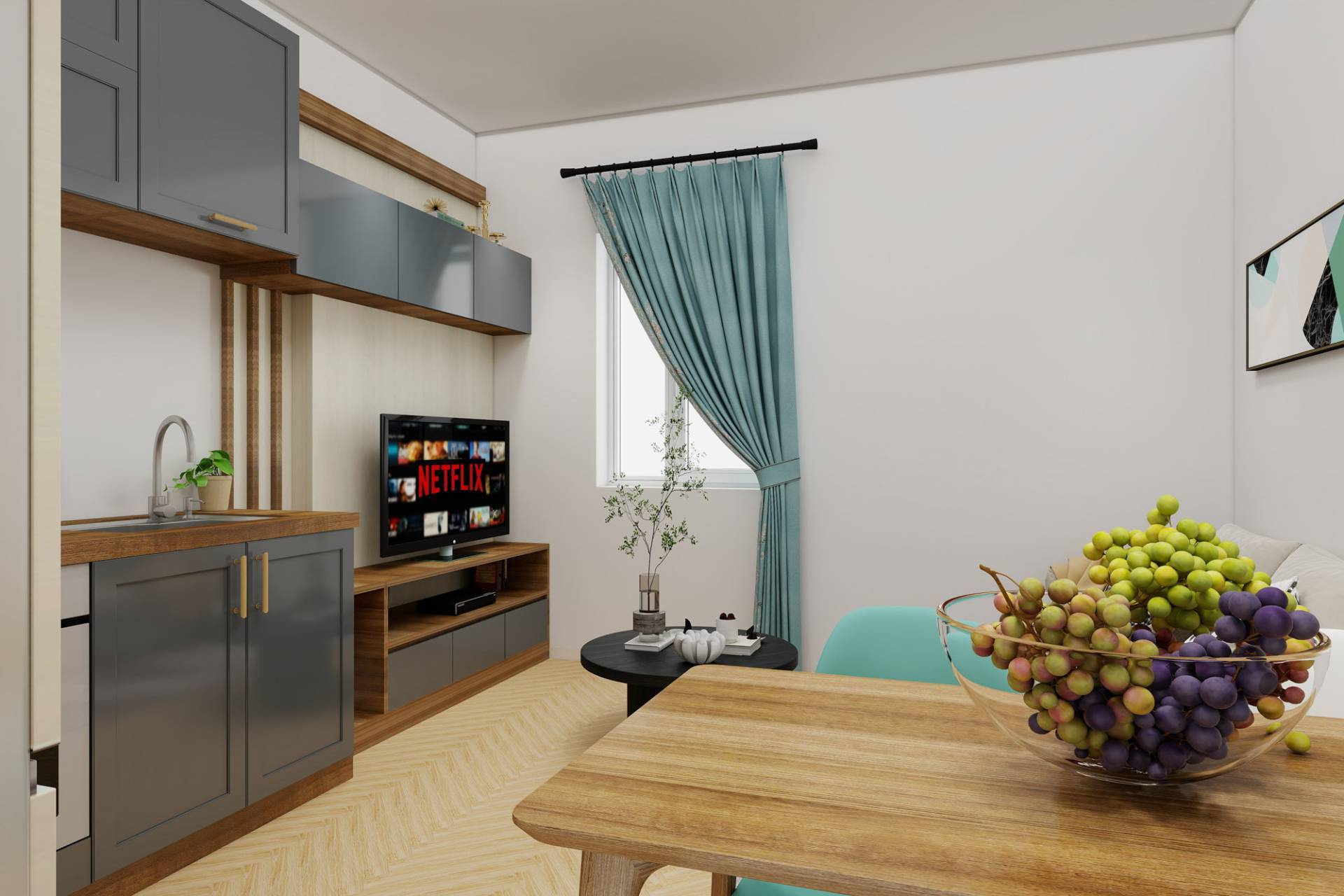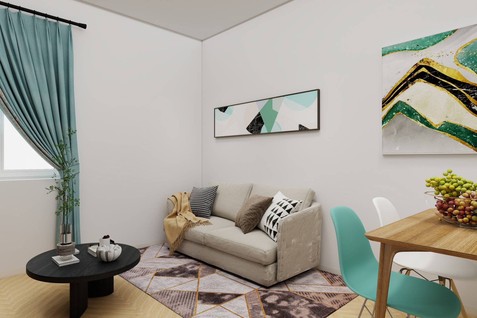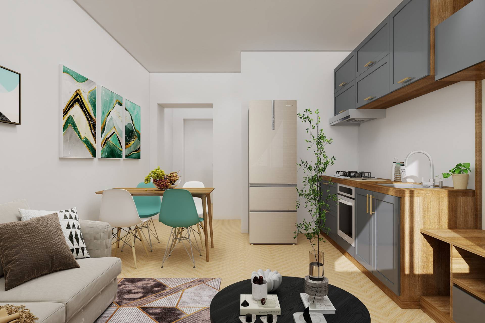Ingresso, accogliente soggiorno con cucina a vista, camera, cameretta, bagno e ripostiglio. Luminoso con affacci esterni.