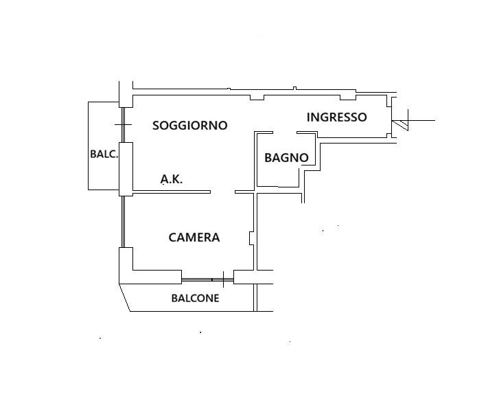 L'appartamento è collocato al primo piano di uno stabile con ascensore e si compone di: ingresso, soggiorno con cucina a vista, camera, bagno e due balconi.