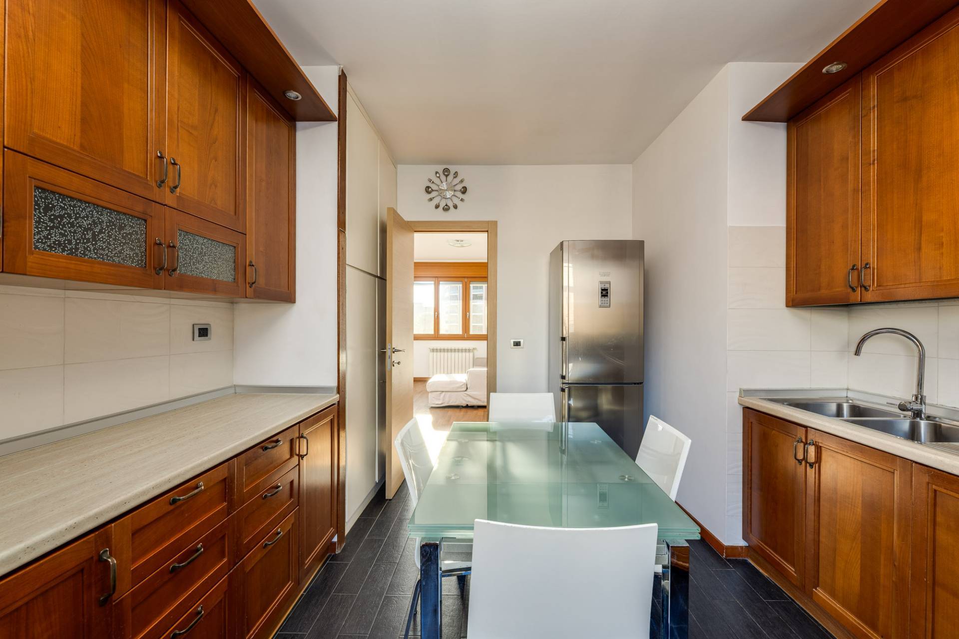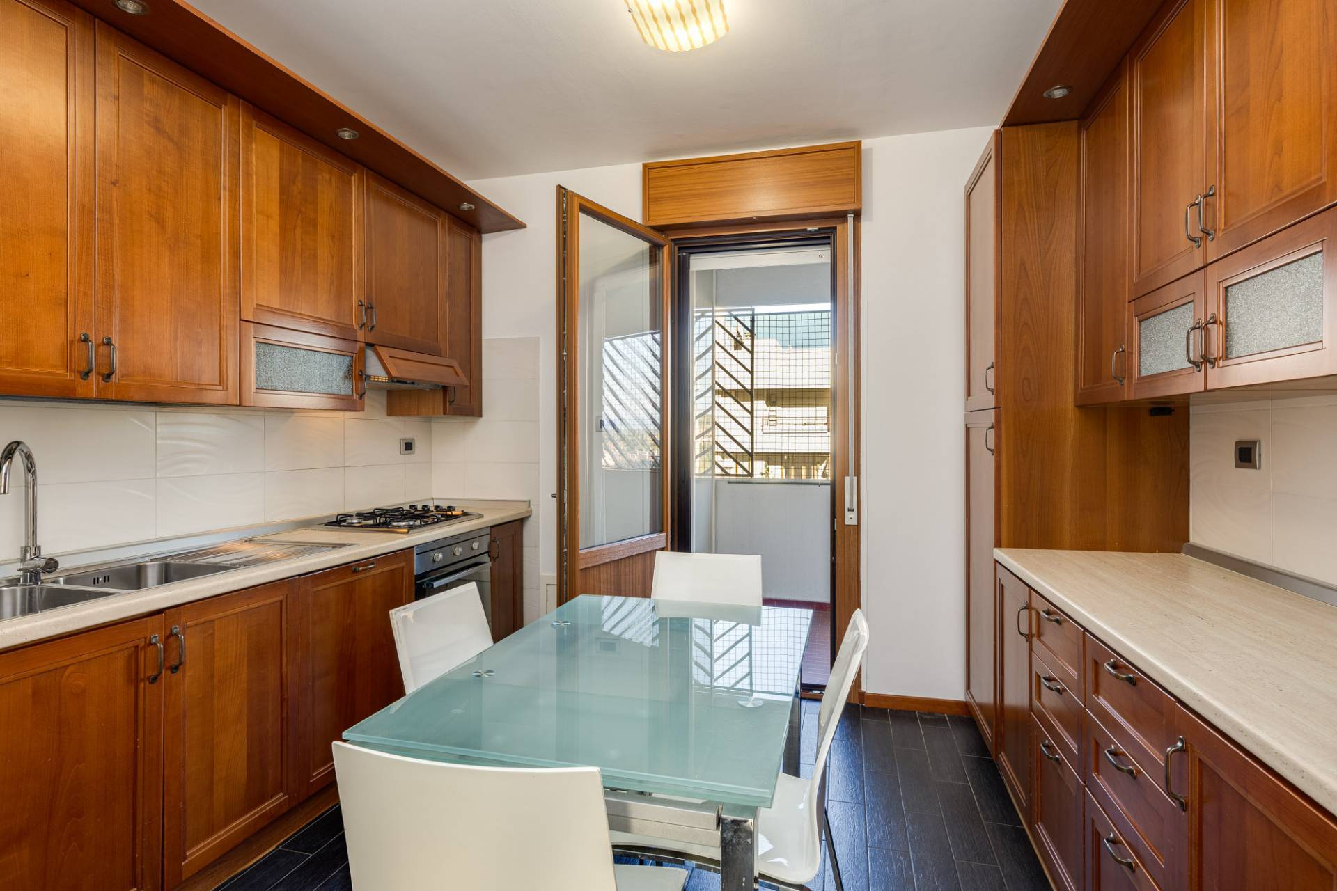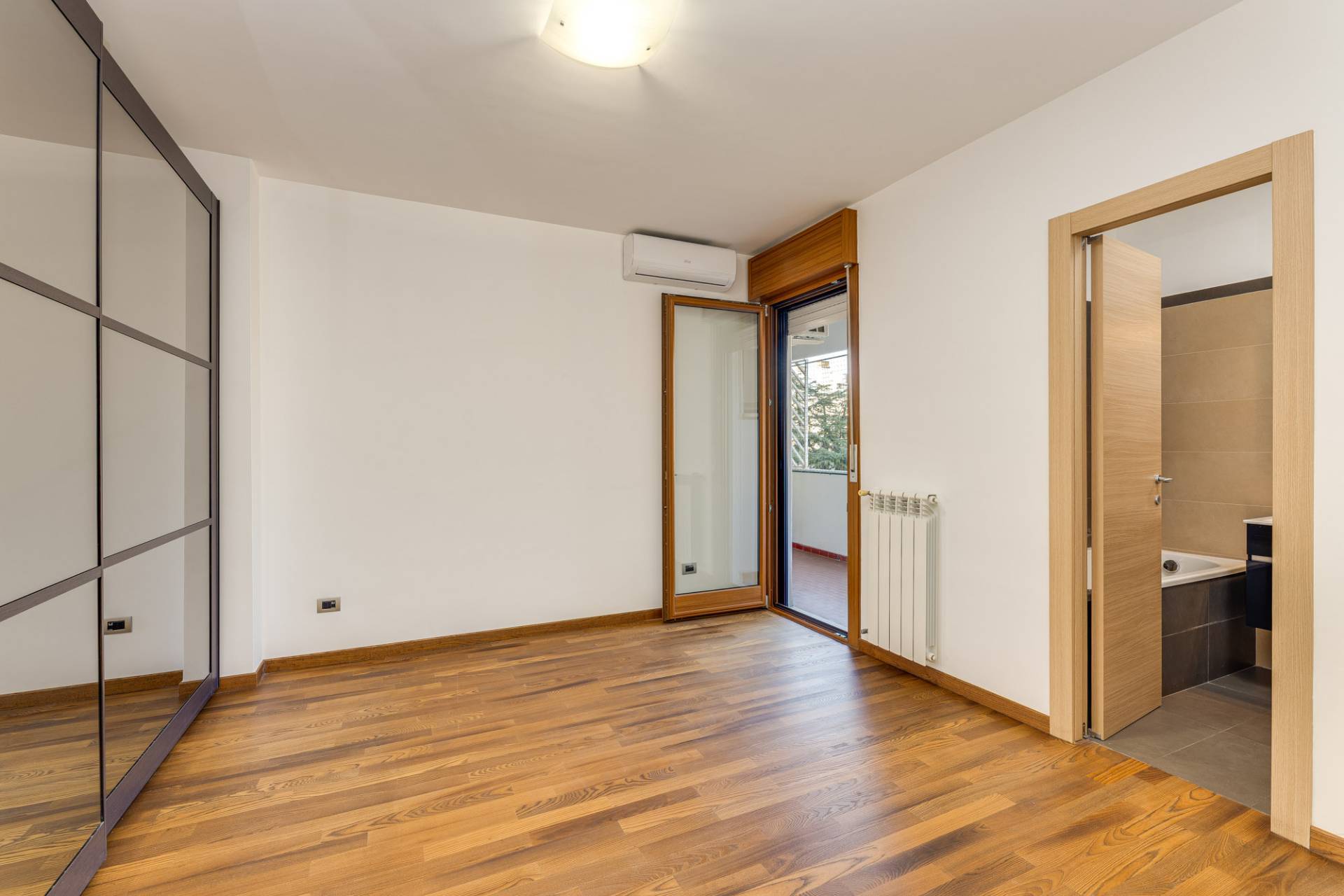 Splendida pavimentazione in parquet in tutto l'appartamento ad eccezione della cucina e dei bagni, infissi doppio vetro in pvc color legno, riscaldamento autonomo. L'appartamento si affitta parzialmente arredato: cucina completa di arredi ed elettrodomestici, divano a tre posti con chaise longue in soggiorno, armadio in una delle camere.