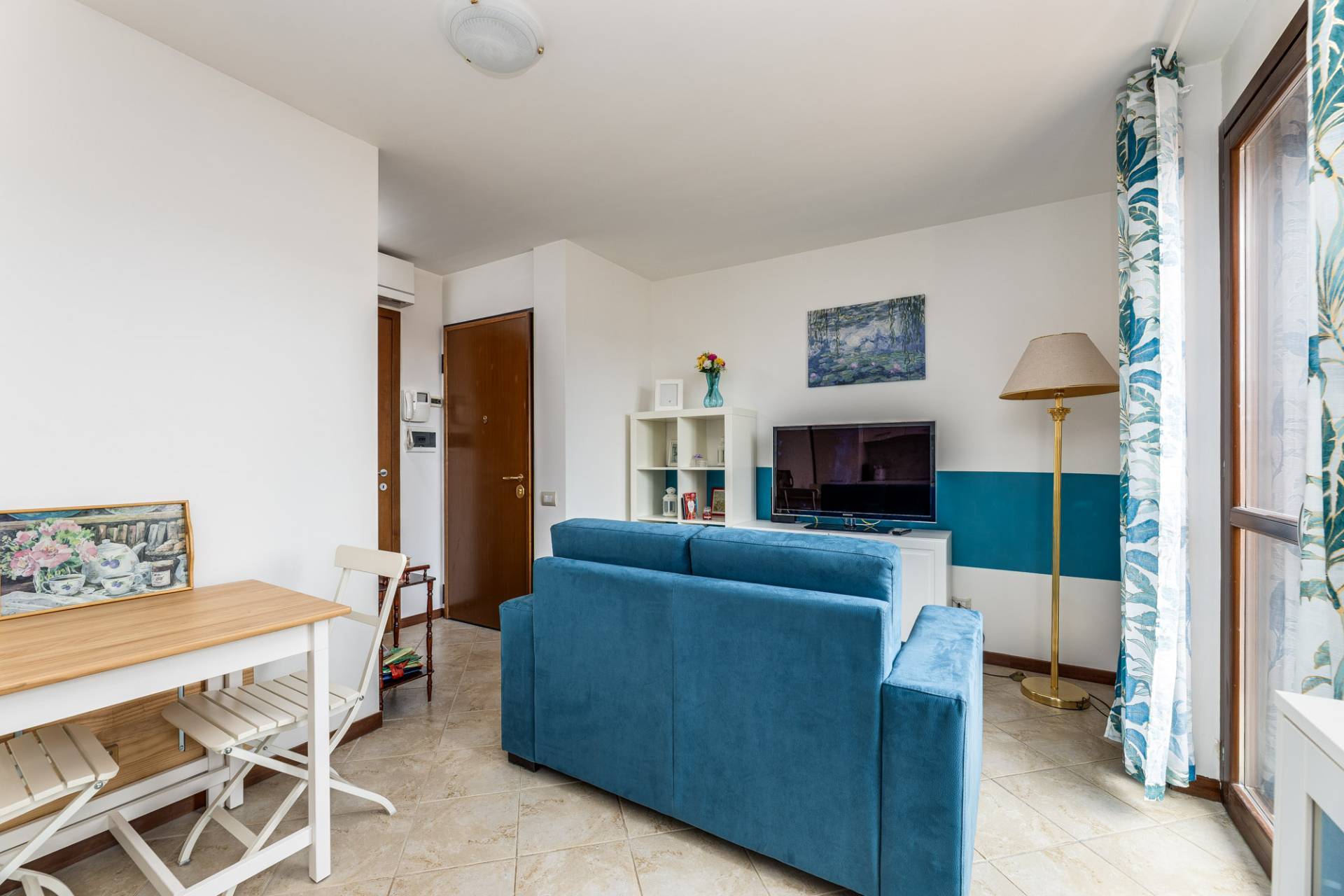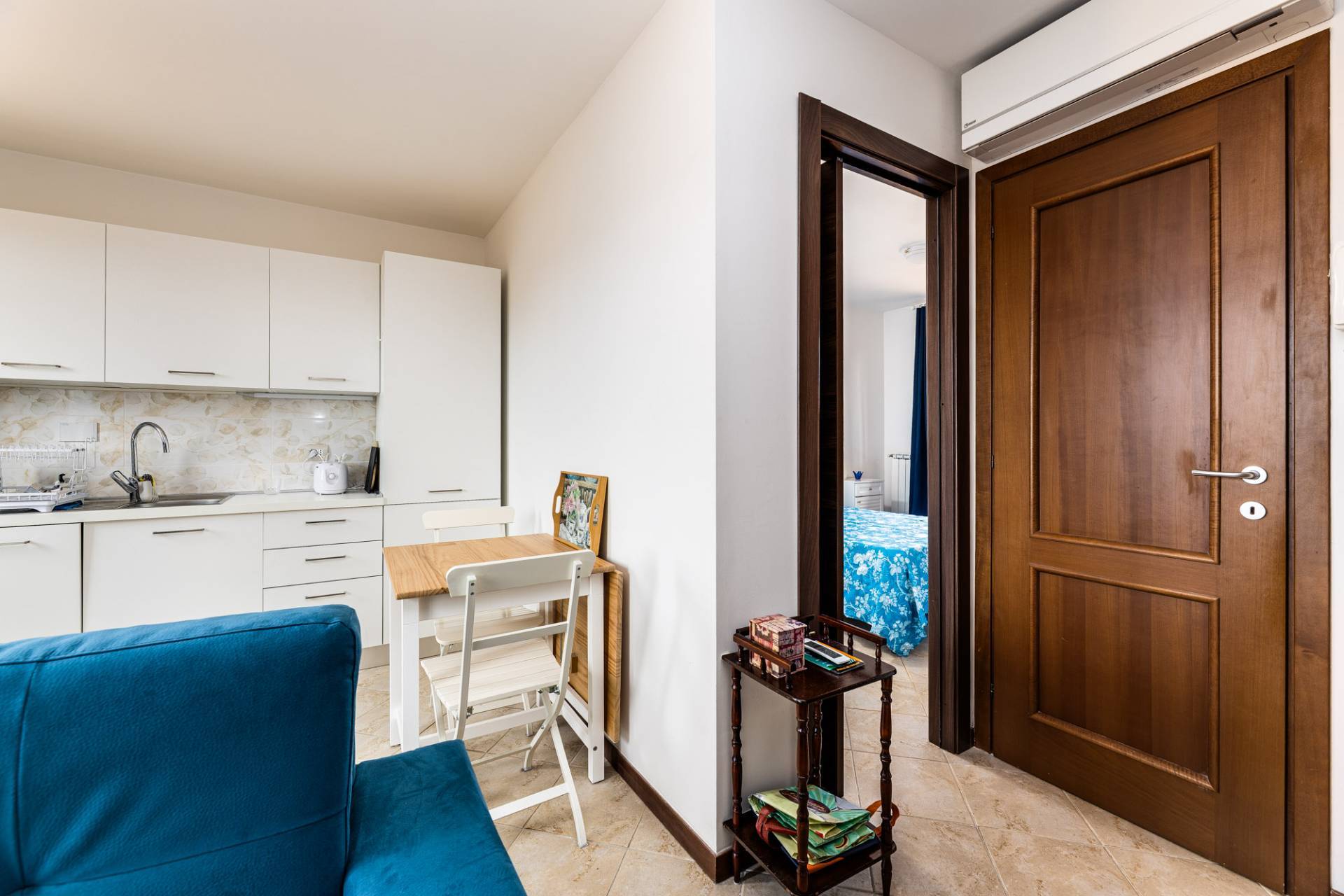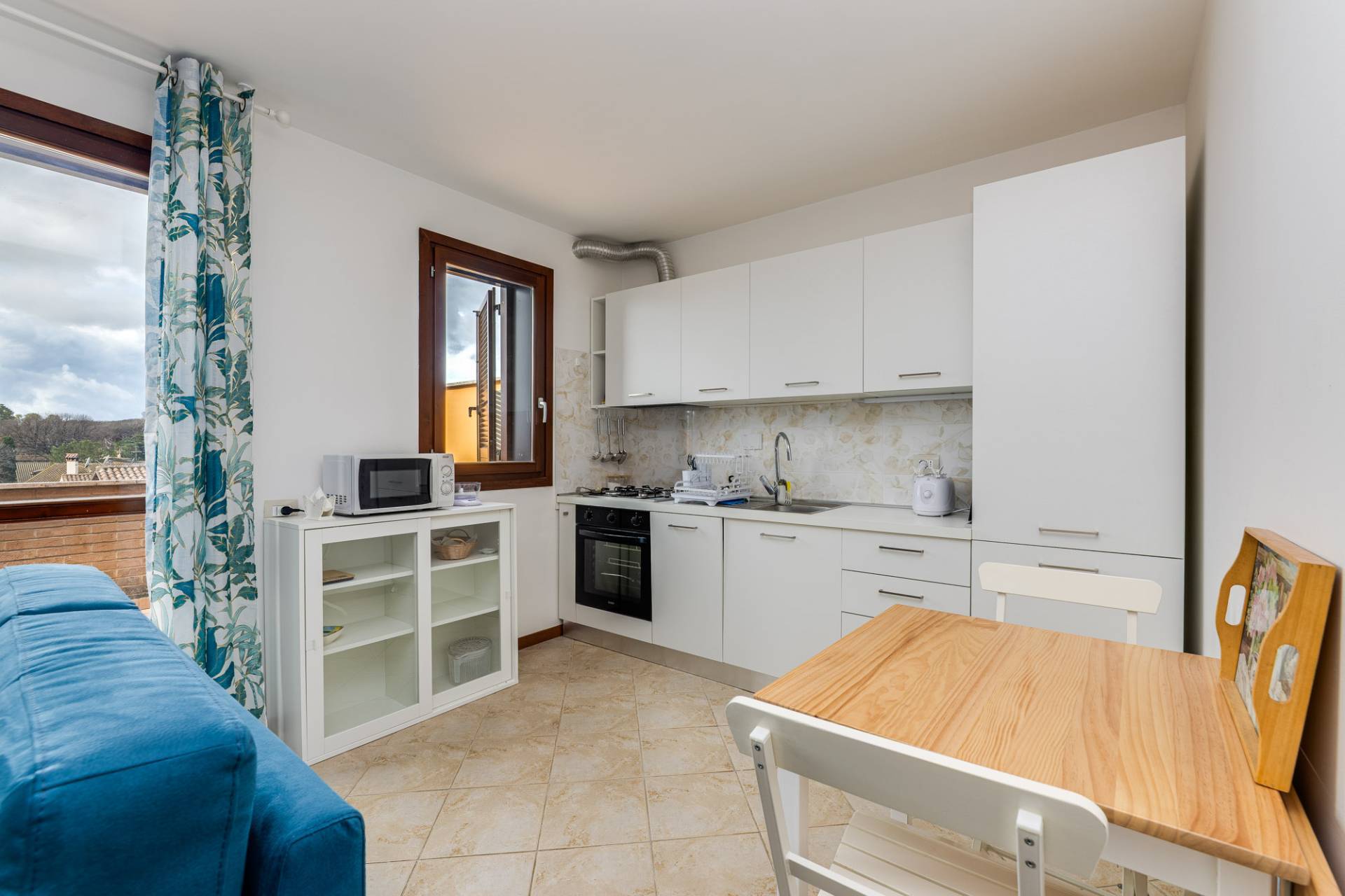 Soggiorno con cucina a vista, camera da letto, bagno con finestra, due terrazzi vivibili con vista aperta e comodo posto auto.