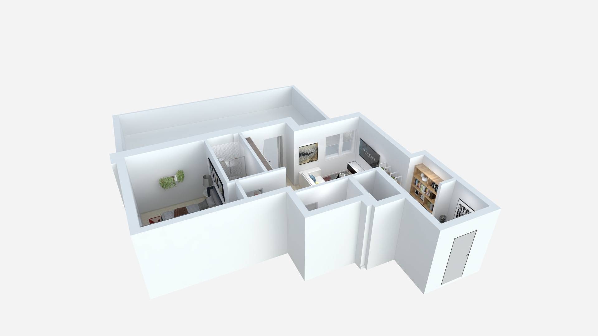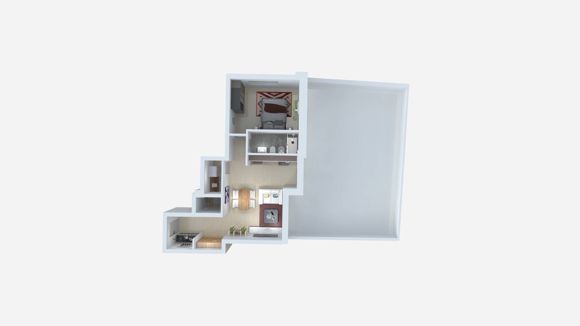 Ingresso, luminoso soggiorno con cucina a vista e accesso diretto all'ampia terrazza privata di 67 mq, ideale per vivere all'aperto, camera da letto matrimoniale, bagno e ripostiglio.
