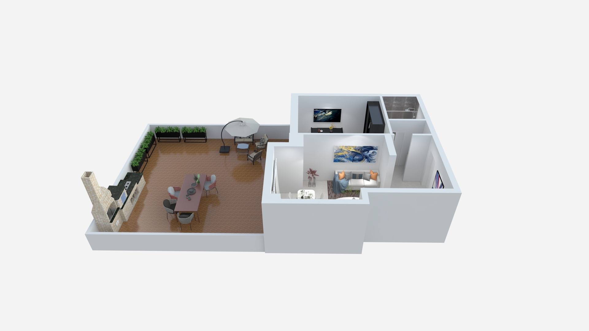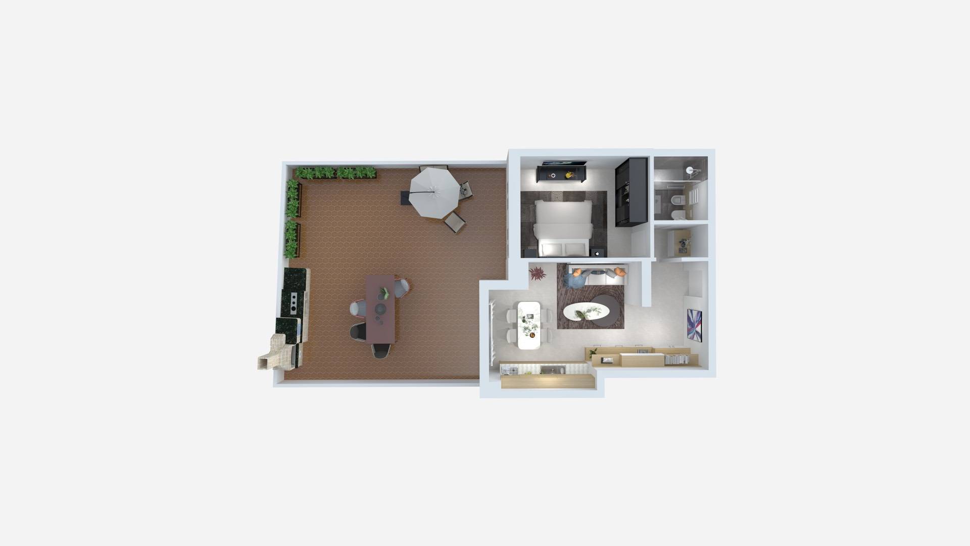 Ingresso, luminoso soggiorno con cucina a vista e accesso diretto all'ampia terrazza privata di 54 mq, ideale per vivere all'aperto, camera da letto matrimoniale e bagno.